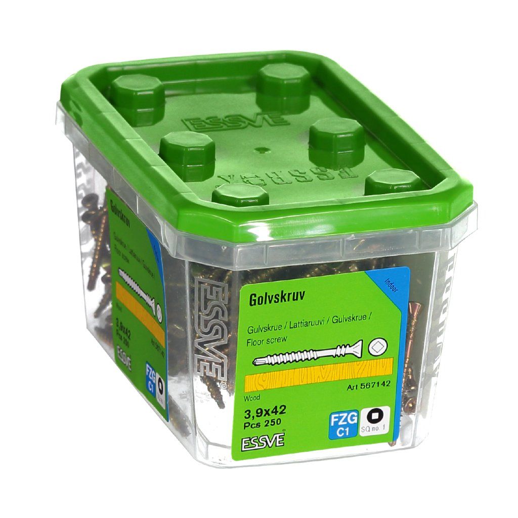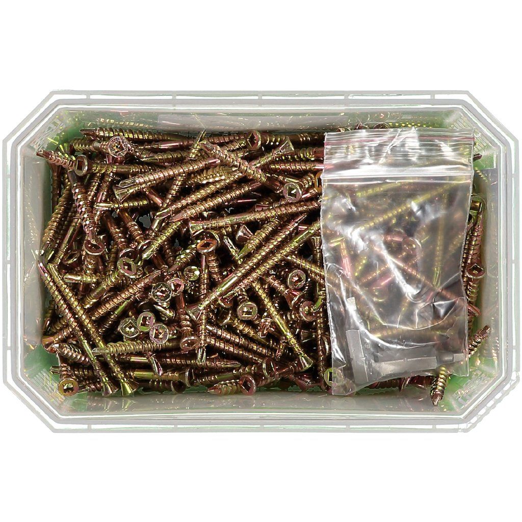 The screw is produced in hardened carbon steel with yellow chromate surface treatment. It is equipped with a square drive no. R1. Each 250 pack includes 1 x bit no. R1.The screw is equipped with a reduced drill point to avoid cracking.
