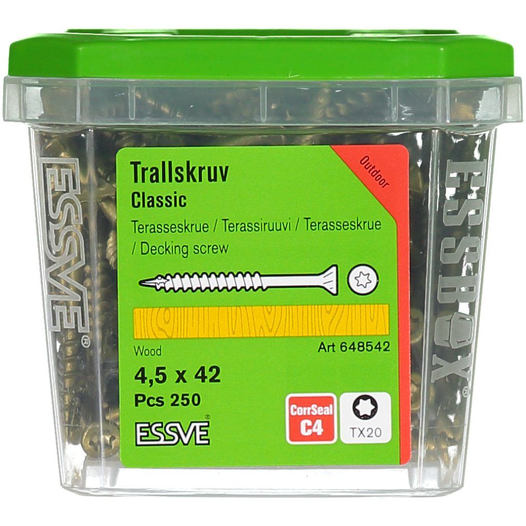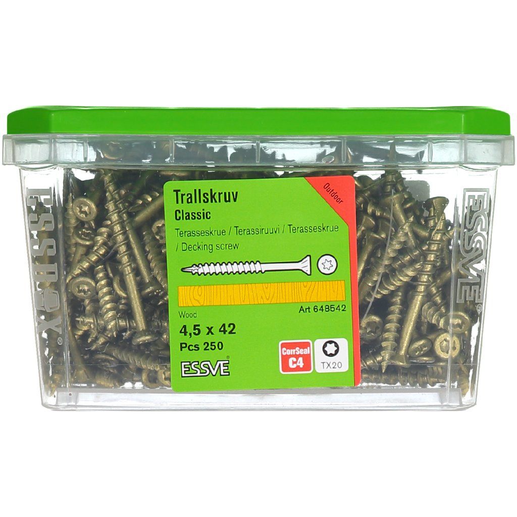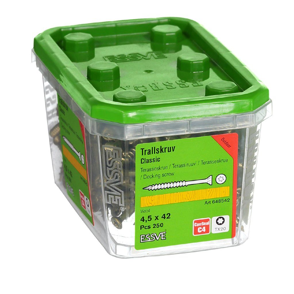 Terasové skrutky ESSVE Classic sa používajú na montáž do drevených podkladov: prvky plotov, drevené terasy a iné prvky záhradnej architektúry. Pri aplikáciách vo vlhkých alebo pobrežných oblastiach sa vždy odporúča použiť skrutky z nehrdzavejúcej ocele.